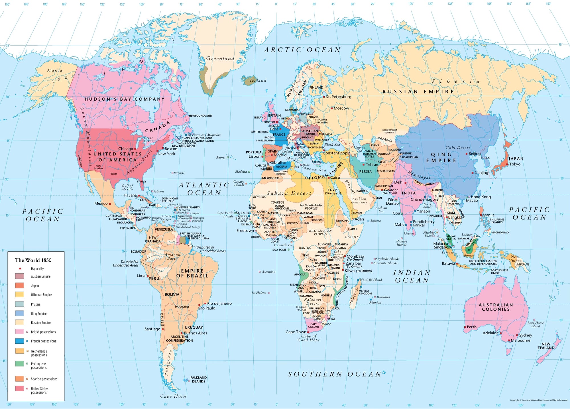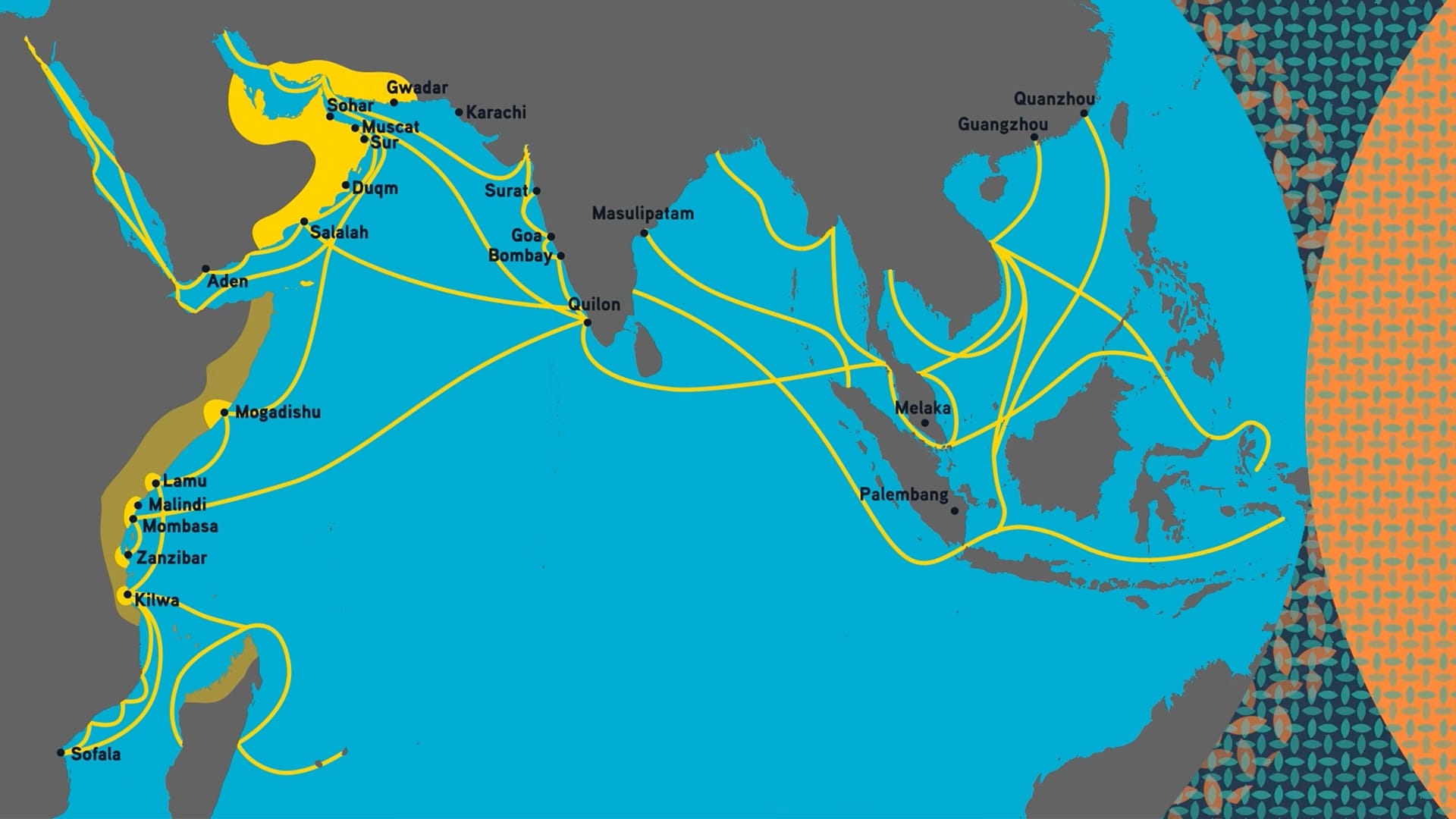 Left: The World in 1850. Source: The Map Archive. Right: The Omani Empire in yellow with its trade connections across the Indian Ocean, c.1850. Source: OER Project.