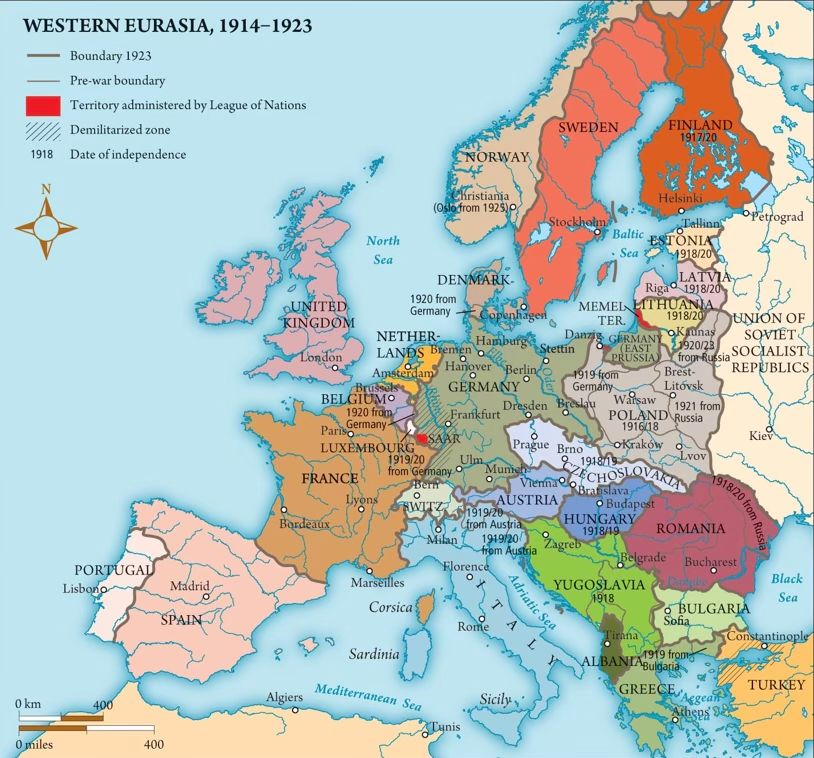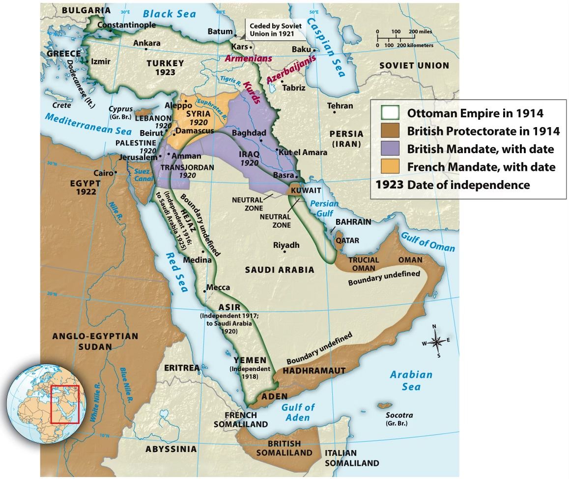 Left: Europe’s new borders. Source: Forging the Modern World. Right: The Middle East’s new borders. Source: A History of World Societies.