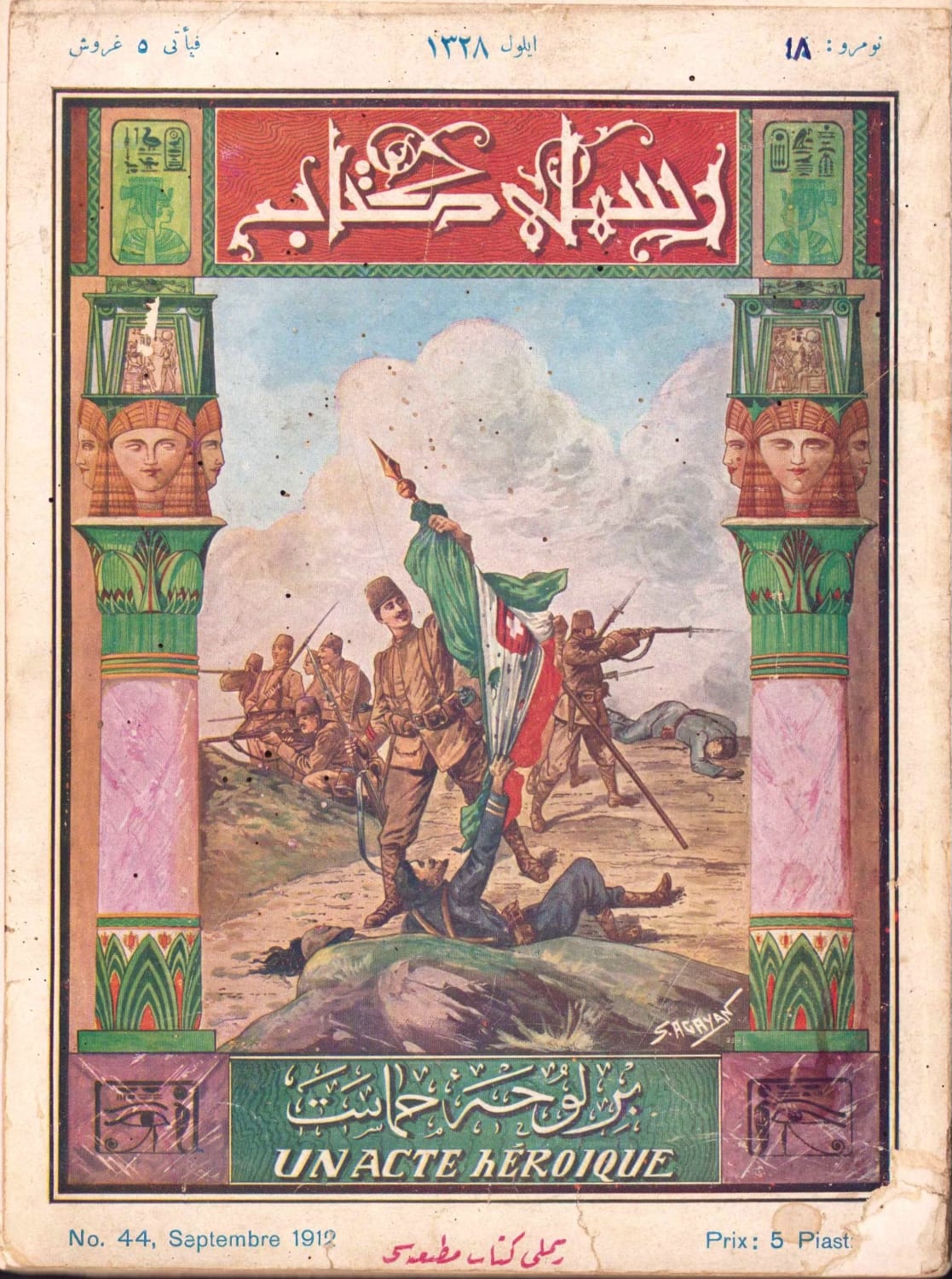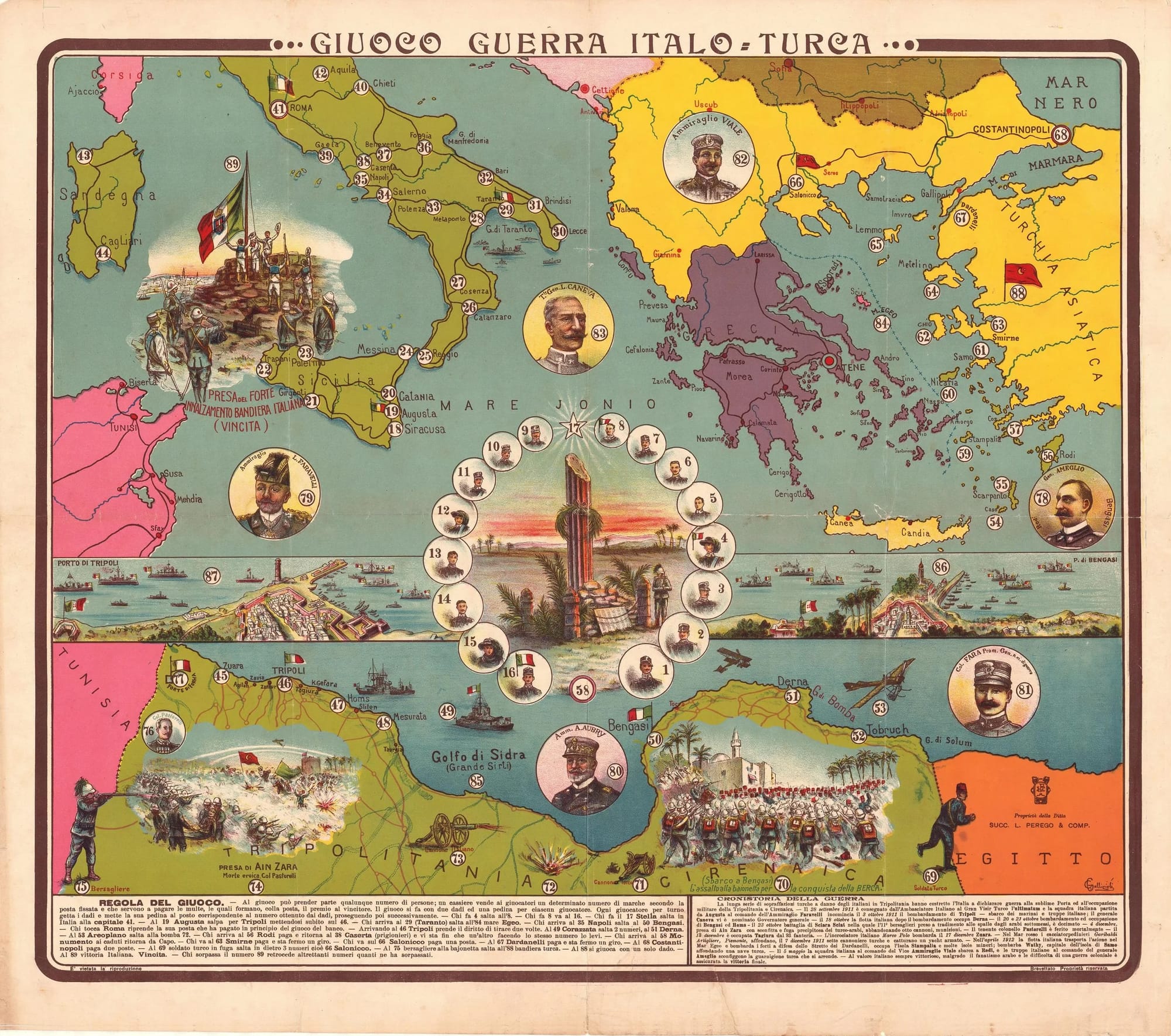 Italian and Ottoman publications in 1912 present the conflict as a regional war between two major powers, not as Italians invading Africa. The Italian “map” on the left shows where all the battles occurred. The Ottoman magazine cover shows one of their few victories in the war.