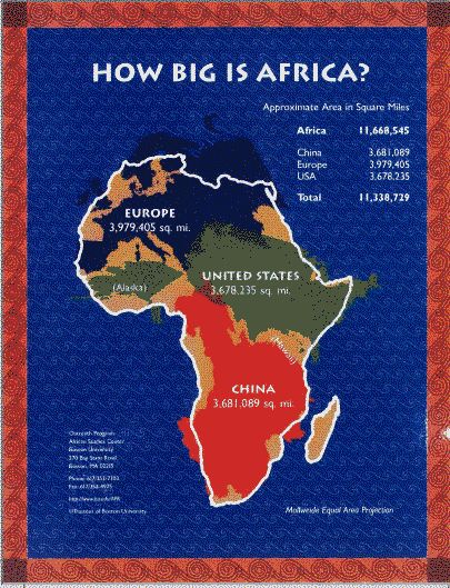 As the map makes clear, Africa is not a small region. Think about how much time we devote in our world history classes to the histories of China, Europe, and the United States compared to the time and treatment of the history of Africa. As teachers, we need to be aware of these choices we are making. Boston University’s African Studies Center offers some excellent lessons about our perceptions and projections of Africa. Given the sheer size of Africa, it is important that we don’t talk about the diverse peoples of Africa as a single, homogenous group. We need to talk about Africa’s diversity and its histories. We also want to be mindful of the language we use in the classroom to describe Africa and Africans. Binyavanga Wainaina’s “How to Write about Africa” is a satirical essay about the tendencies of many writers to exoticize and caricature Africans.