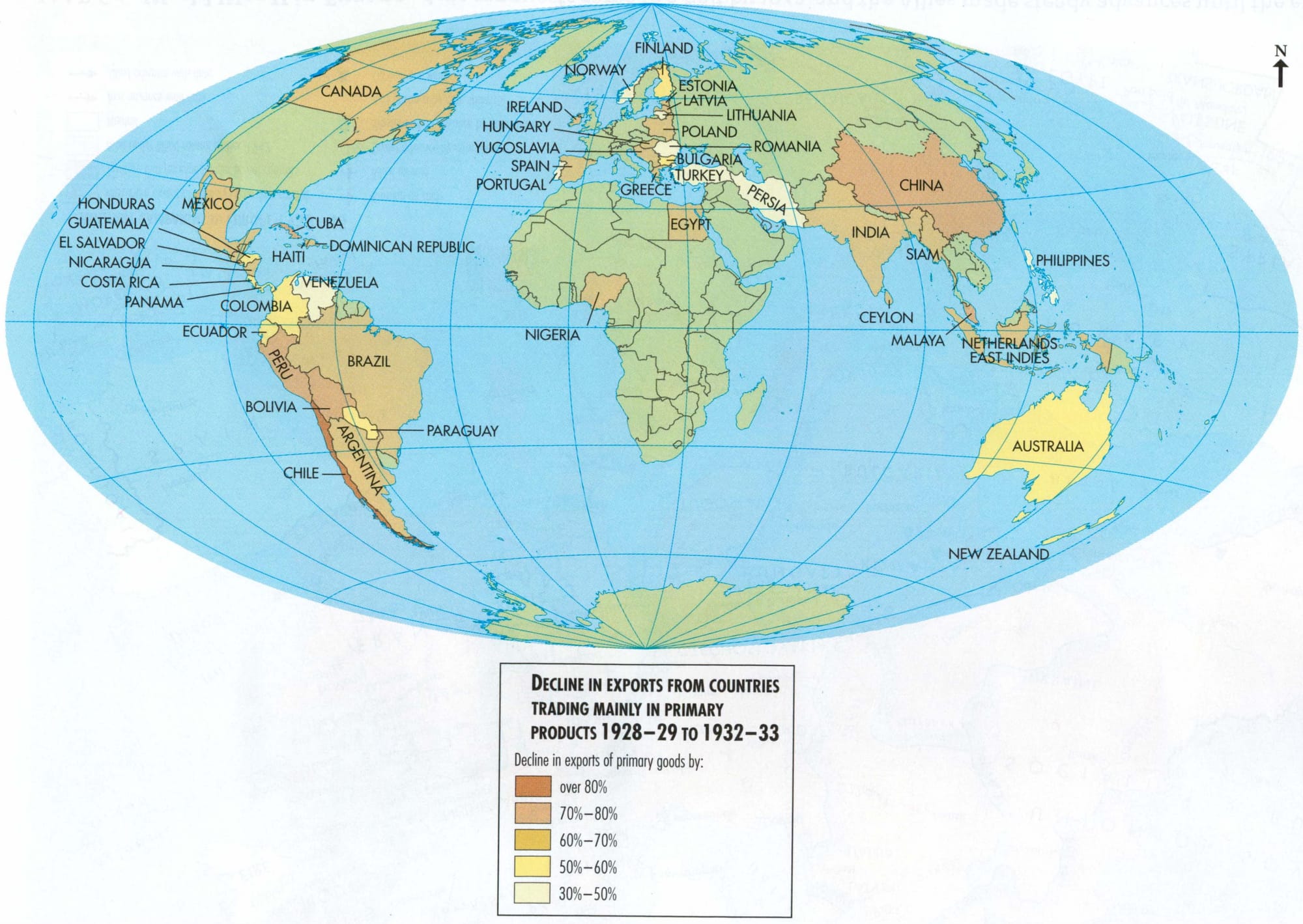 Left: Effect of the Depression on commodity-exporting countries from 1929 to 1933. Source: O’Brien’s Atlas of World History. Right: Contraction of Global Trade from 1929 to 1933.