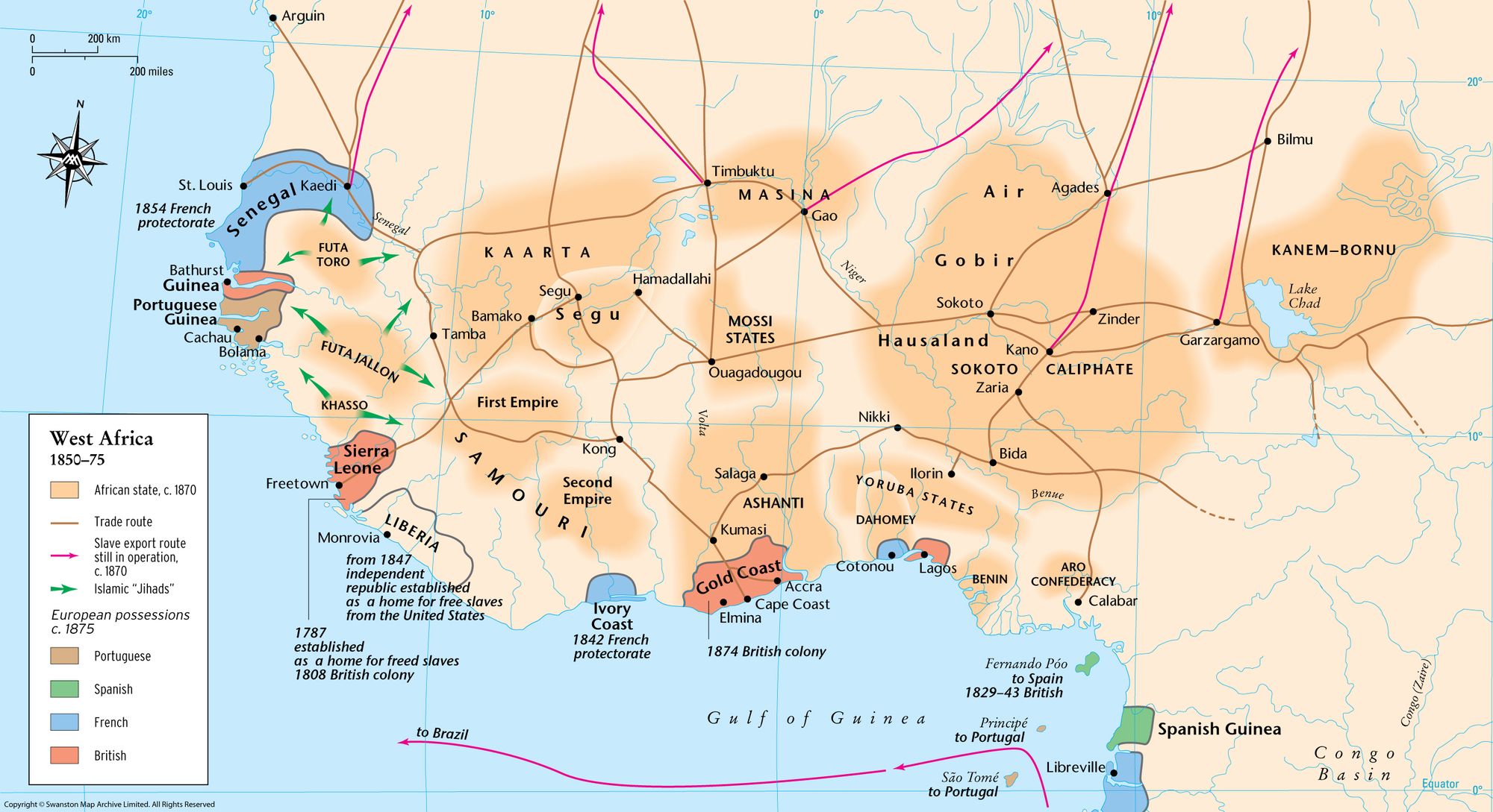 I am exaggerating a little, but it’s hard to find any significant textbook discussion of how African societies developed between the end of the slave trade and before imperialism. (If you have an example, please share it with me or leave a comment below.) Five years ago, I spent my summer reading a lot of African history, and two books stood out as ideal resources for world history teachers. Robert Harms’ Africa in Global History with Sources weaves African history into global historical patterns. He also includes primary source excerpts and further readings at the end of each chapter. African Voices of the Global Past: 1500 to the Present, edited by Trevor Getz, contains helpful introductory essays and many primary sources written by Africans. Both books include chapters dedicated to exploring how African history in the middle of the nineteenth century was connected to Western Europe’s industrialization. The arguments in those books have significantly influenced this post.