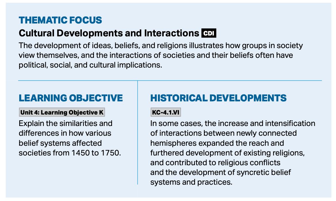 During the Early Modern era (c.1450 - c.1750), new global connections rapidly increased cultural exchange. As cultural traditions spread, there was an increase in syncretic practices. Even though students have grown up with syncretism (think about Christmas trees), it can be one of the more challenging concepts to teach. How do we show the blend of two different cultural or religious traditions? And how do we do it in a way that centers Indigenous Americans? As the Spanish colonized the Americas in the sixteenth and seventeenth centuries, they promoted the spread of Catholicism. While many Indigenous Americans converted, they often followed beliefs and practices associated with Indigenous belief systems. There were also ways of weaving aspects of their indigenous culture into Christian and European traditions.