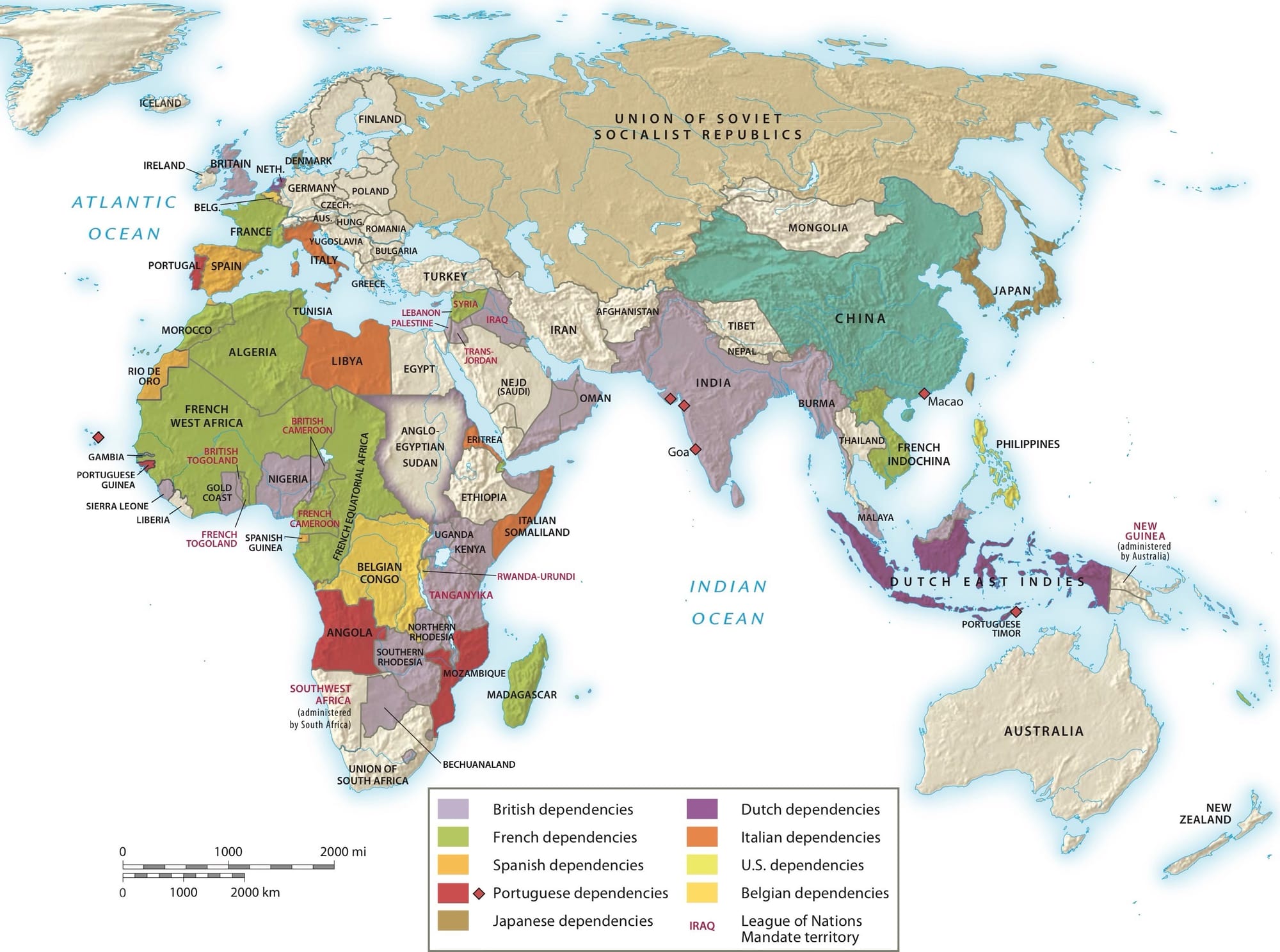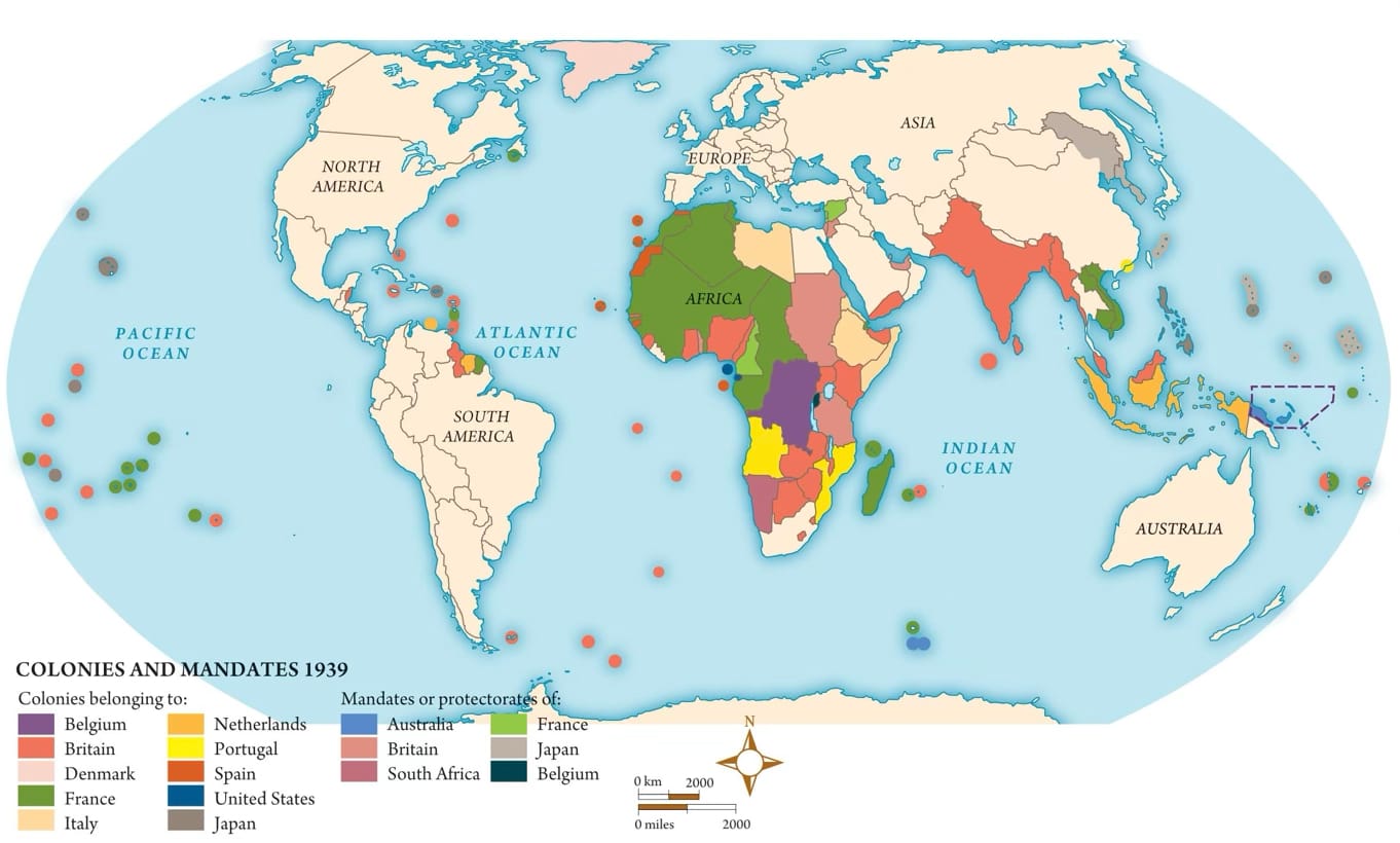 Left: Colonies in Afroeurasia in 1925. Source: Panorama: A World History. Right: World colonies in 1939. Source: Forging the Modern World: A History.